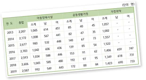 지난 2020년 5월 보건복지부가 공개한 ‘보호대상아동 현황보고’에 따르면 보호대상아동 수는 △2005년 9420명 △2010년 8590명 △2015년 4503명 △2019년 4047명이다. 점차 감소하고 있는 추세이지만, 이는 절대적인 수치가 줄었다기 보다는 출생률 감소의 영향이라고 보호종료청소년 지원 단체들은 분석한다.