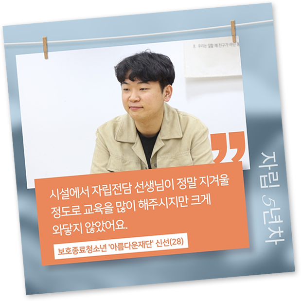 “시설에서는 각자 맡은 일을 하지만 자립하면 뭐든지 스스로 해야 하잖아요. 과소비도 많이 하고 밥도 제대로 안 챙겨 먹었어요. 생활이 엉망이었죠. 스스로 자책 많이 했는데 저를 잡아줄 사람이 없는 거예요. 케어센터 선생님과 함께 생활하면서 규칙적인 생활 습관을 배우게 됐는데 그런 시간이 필요한 거 같아요. 보호종료청소년은 (시설에서 개인행동을 할 수 없는 단체 생활을 하다가) 갑작스럽게 생긴 자유를 올바른 방향으로 나아갈 수 있도록 잡아주지 않으면 결국 힘든 상황이 되는 거 같아요.”